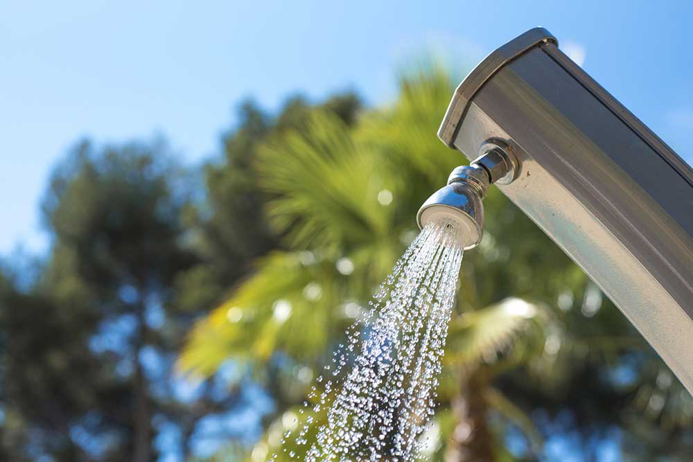 - Une colonne de douche : elle se présente comme une colonne de douche de salle de bain avec un pommeau fixe en hauteur et un mitigeur. Elle est fixée au sol et raccordée au système d’eau.